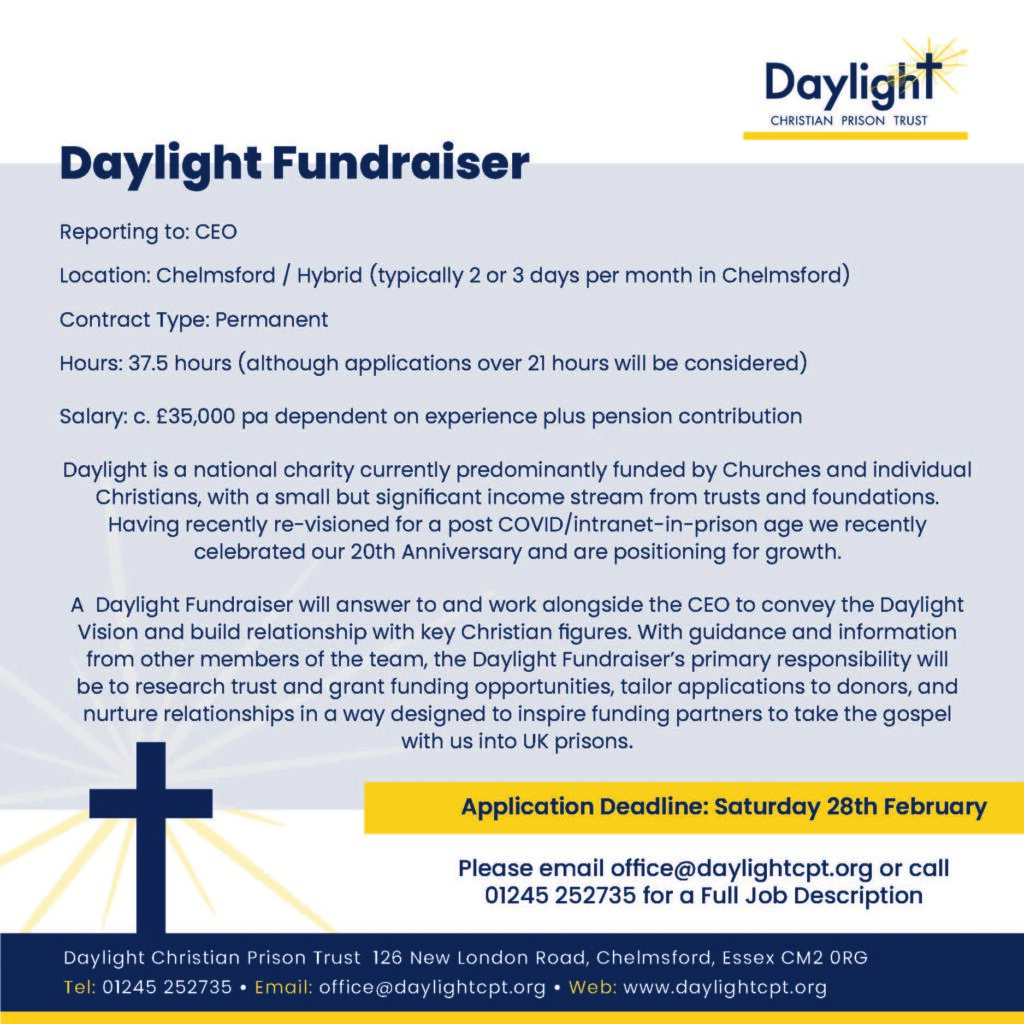 You can download the job description here. If this role is of interest please send a CV and covering letter to office@daylightcpt.org. Please be sure you have understood the faith requirement and respond by 28th February.