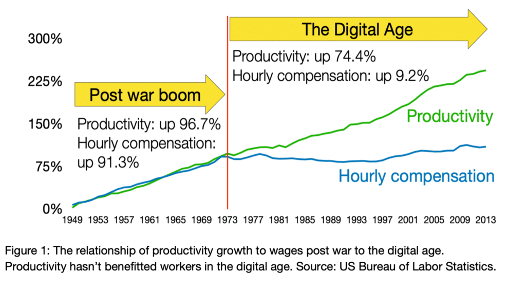 The reality for digital technology is however somewhat different, at least as far as its economic benefit to the general population. Figure 1 shows how the period between 1949 and 1973 in the USA, wages kept pace with increasing productivity.3 The years between 1973 and 2013, the digital age, saw productivity increase by 74.4%, yet the hourly compensation of workers rose by just 9.2%. During this period however, the median wage gap between the lowest and highest paid workers widened very significantly with the lowest decreasing to -5% and the highest increasing to 41%. In their book, Power and Progress, MIT economists Acemoglu and Johnson survey 1,000 years of technology progress and argue that it is mostly the elite and powerful that benefit from innovation.4 They cite the example of the Industrial Revolution to show that it takes pressure from ordinary people and government regulation to ensure that the economic benefits of improved productivity flow down to the workers. Automation in the 1980s displaced a significant number of blue collar workers. Today, AI applications are impacting white collar workers and professionals in all spheres spanning the creative arts, computer programming, marketing, accounting, the law and medicine along with office workers using Microsoft’s copilot, embedded in Office 365.