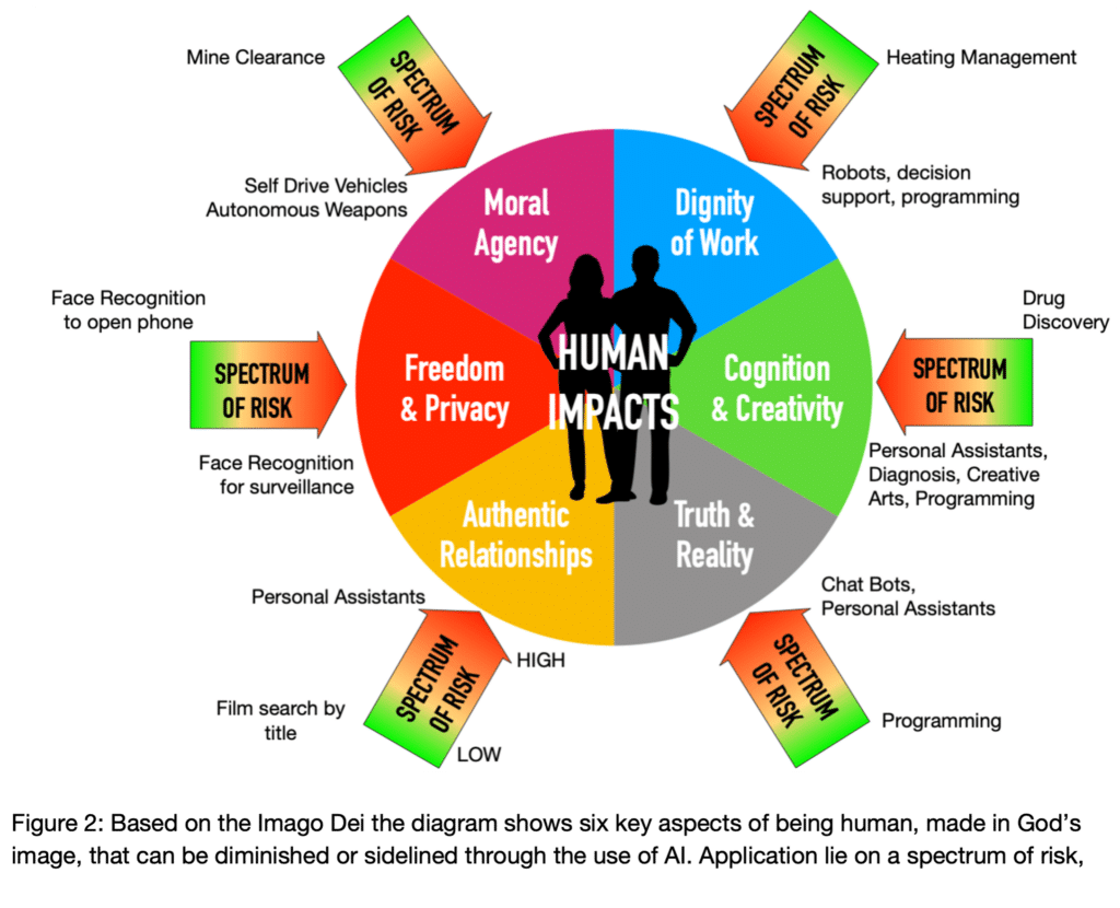 There is a spectrum of risks associated with our use of AI, some applications will have no impact on our ability to faithfully image Christ in the spheres where God has placed us, whether church, friends, family or work. Other applications will have a significant impact so we will need to evaluate our engagement in each use case and think about how it will shape our behaviour over time as well as how our use will impact others and their view of Christ, who he is and what he is like. Many applications impact more than one of the six human areas shown in Figure 2.
